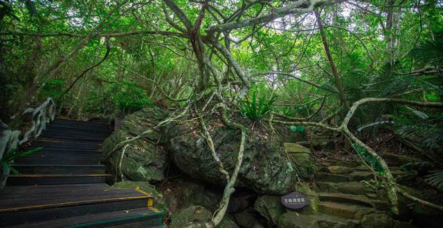 尊敬的贵宾朋友,眼前有五棵榕树构成了一个奇特的景观,您看它们根连着根、枝挽着枝,就像一把张开的巨大绿伞,为您的到来挡风遮雨,我们叫它“五榕迎宾”。您仔细看看,能不能分出哪根枝干是哪棵榕树的?是不是很难分辨呢?它们啊是不分彼此,融为一体,支撑着同一片天空,搭建起一方小天地,这不就是和谐社会的最佳典范吗?什么是和谐呢? 我们知道,和谐就是“配合得适当和匀称” 的意思。平时我们经常听到这样一句话,“一生二,二生三,三生万物”,这里的一指的是世间的万物的本源,二指阴阳,就是世界上所有的事物,都是由阴和阳两方面的特性所组成,或者说都是由对立的两方面所构成,比如说男与女、天与地、黑夜与白天。那么这个三又是指什么呢?三实际上是指阴阳平衡,只有平衡,才能“生万物”,才能有繁荣,白天和黑夜平衡才会有日子过,男人和女人平衡人类才能繁衍后代,世界才会正常发展,偏向于任何一方,都不会是健康的。和谐也就是阴阳平衡,人与人之间,人与自然之间和谐相处,整个社会就会形成一种向心力,就像这五棵榕树一样,尽管不分彼此,但是却共同撑起了一片天空。您说是吗? 好,请您继续向前游览。