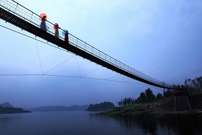 浪漫鹊桥与鸟岛隔湖相望,桥长100米,宽2米。由六条钢索平行并列为桥身,上面铺木桥做桥面,两侧各有链条钢索作为扶手。整座桥横跨长寿湖面,站在桥下所见鹊桥,有如凌空飞彩练;站在桥上俯瞰长寿湖,则见碧水映长虹。鹊桥是依据牛郎织女的故事而建,是浪漫爱情的象征,是情侣、夫妻的好去处。