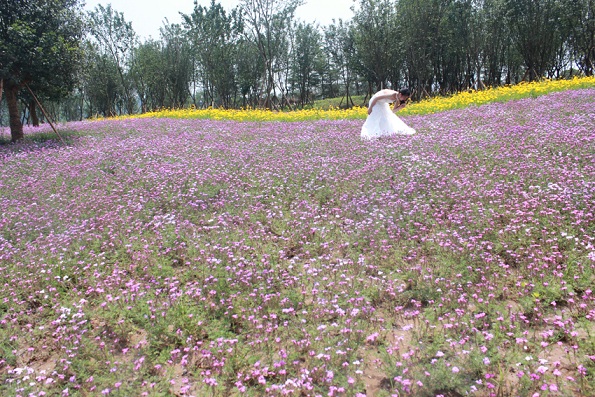 浪漫花田以万寿菊、串红、孔雀草、石竹等不同季节的应时花卉绘成,形成鲜明的观赏景色。整个花田以绿色、黄色、紫色等精心搭配,精美别致,极富韵味,大片大片的彩色被镶嵌在无尽的绿色之中显得异常斑斓,铺天盖地娇艳给的花朵给人无限的遐想。身处花田,满眼的姹紫嫣红,花香是扑鼻而至,芬芳怡人,给人前所未有的幸福感和满足感。
