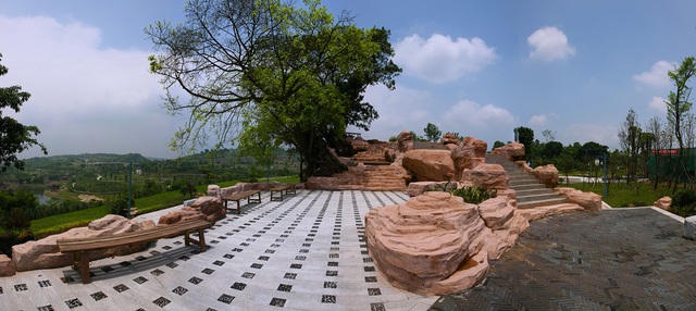 放眼湖中,波光粼粼,岛影成趣,船帆竞渡,好一幅江南水乡图画。观景台的情人树可不是一棵普通树,而是一棵傲然挺立几百年的一棵古黄桷树。这棵树枝繁叶茂,从上面看是一棵独立的树,站在观景台的下面看它是两棵树,且两棵树的根系相互交织缠绕,形成一个心的形状,犹如一对拥吻的情侣,所以得名情人树。